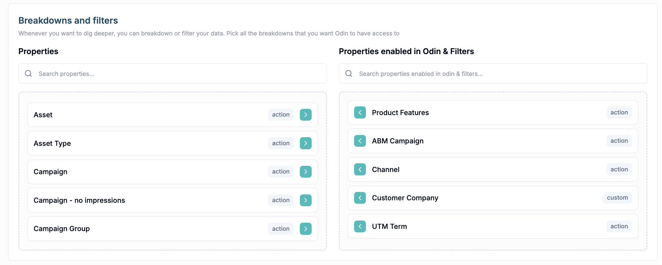 Same as with breakdowns and filters, move goals to the right to enable them for Odin. Funnel stages are enabled by default. Remember that less is more when it comes to data, so mindfully pick which KPIs you want to report on, not to create noise. Disabling old metrics is as important as enabling new ones.