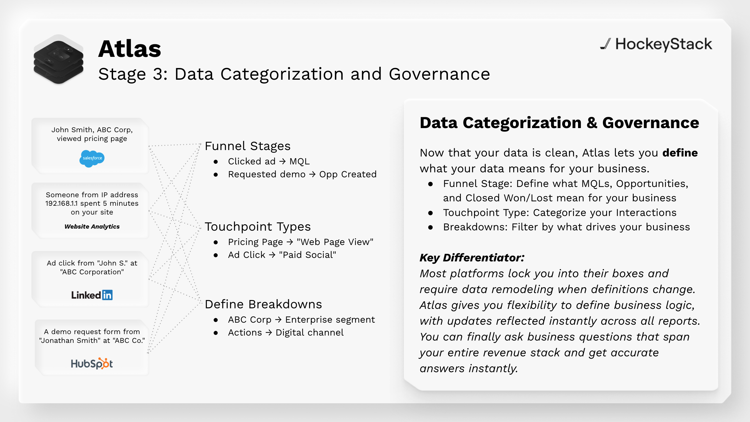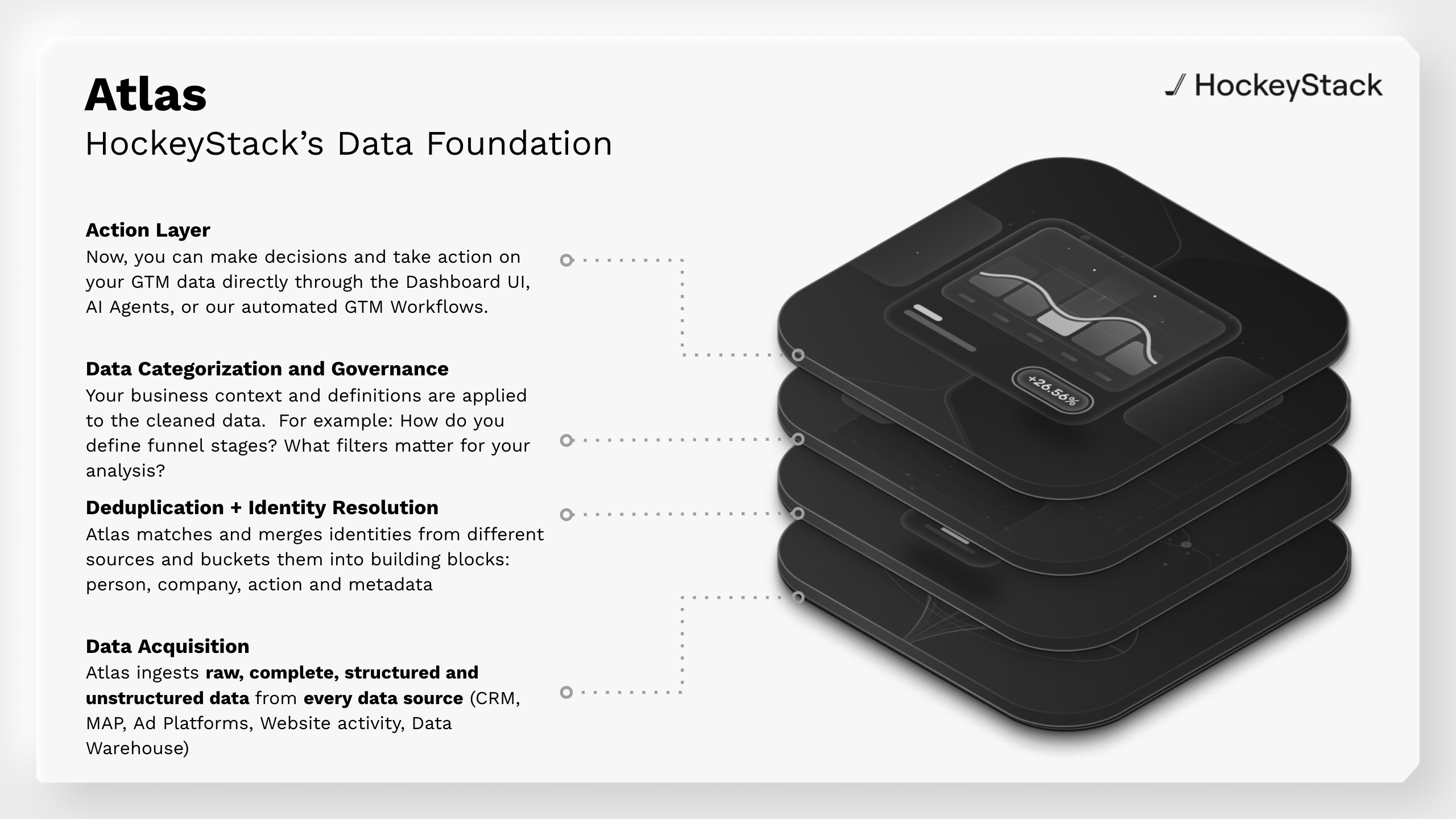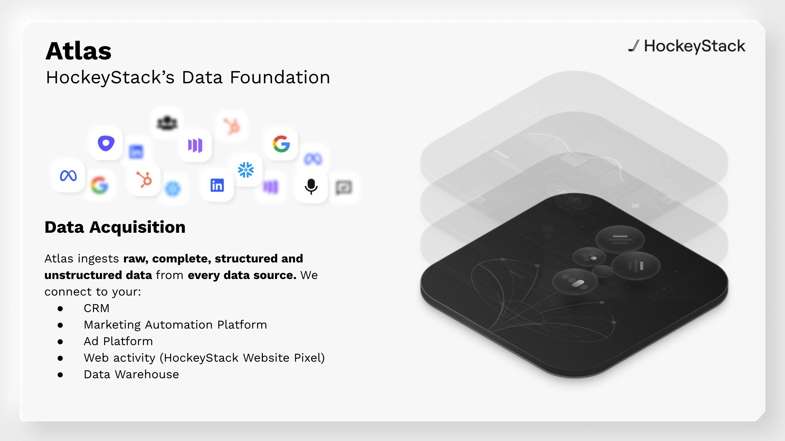Atlas is the Data Foundation that turns what you read in *“*[*What Will My Data Look Like?*](https://docs.hockeystack.com/documentation/the-hockeystack-data-model)*”* into a living, governed, and actionable model. It:
