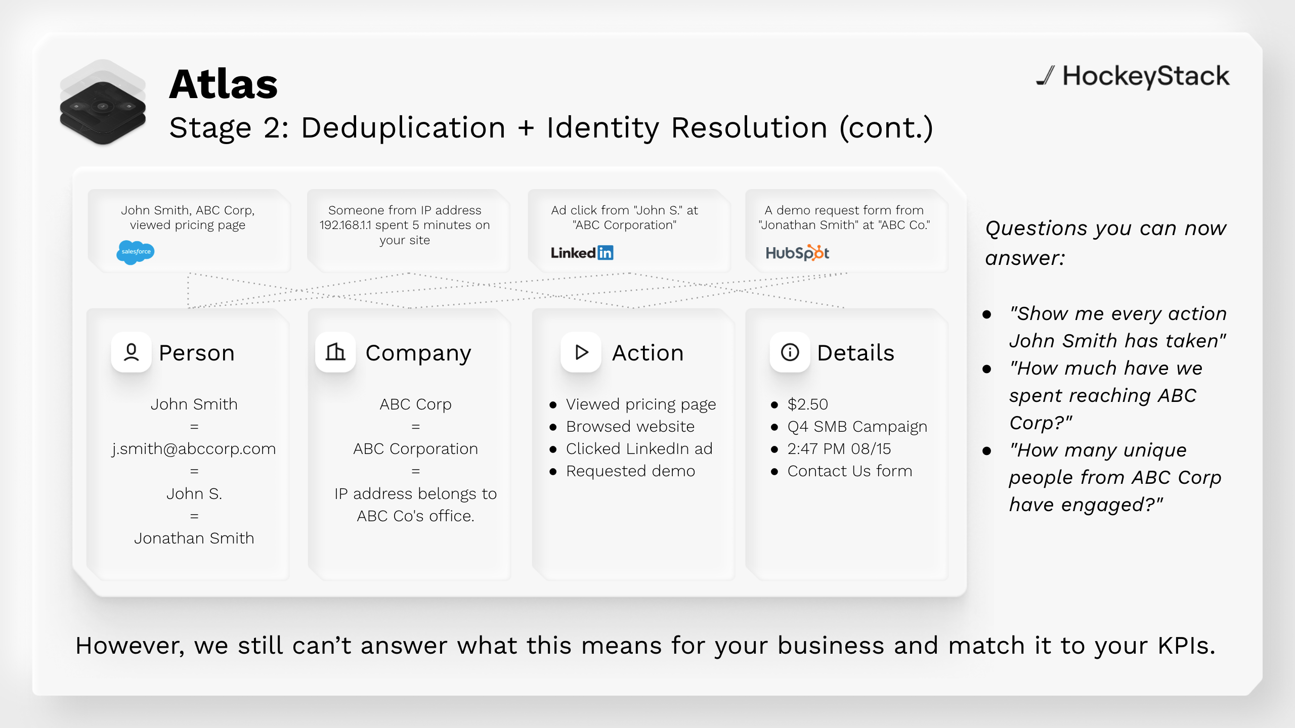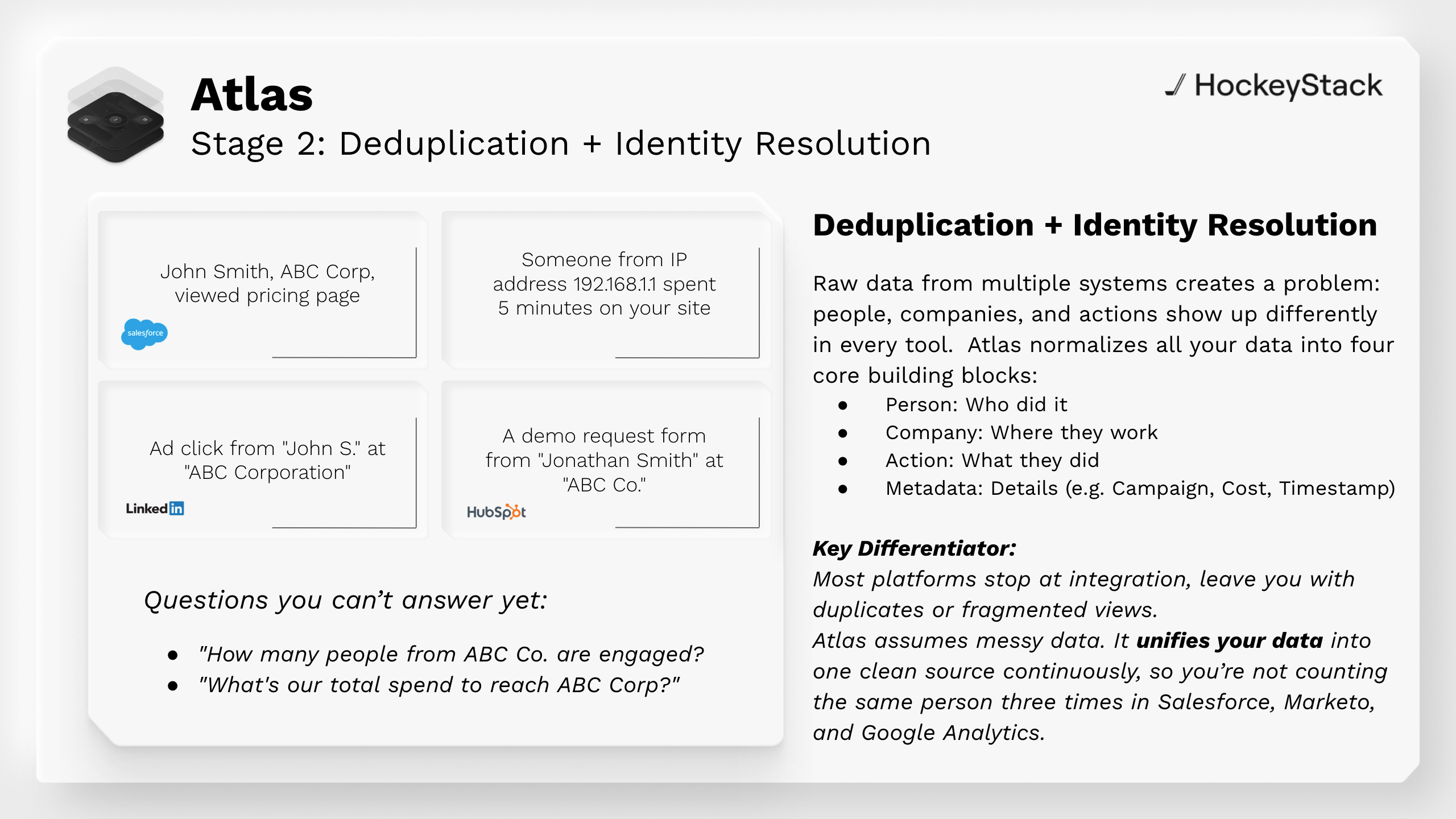 With those building blocks, Atlas ensures that multiple versions of the same user or account collapse into a single, accurate identity across systems.