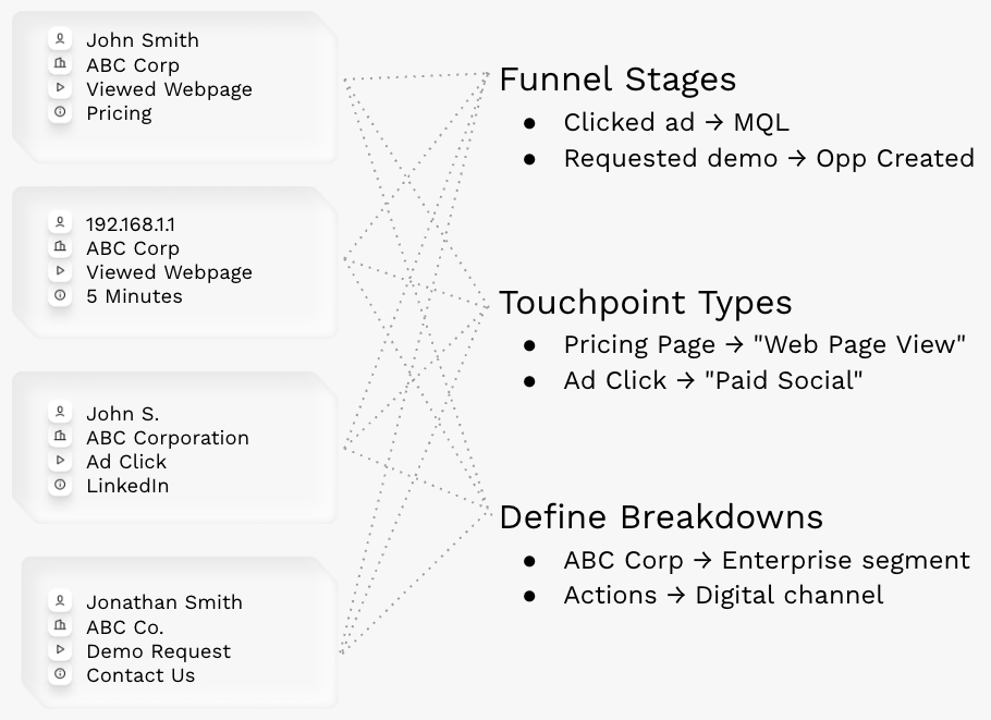 Once deduplication is resolved, Atlas aligns every action on a **common timeline** - ad impressions, website events, form submissions, sales touches - all merged under a single identity.