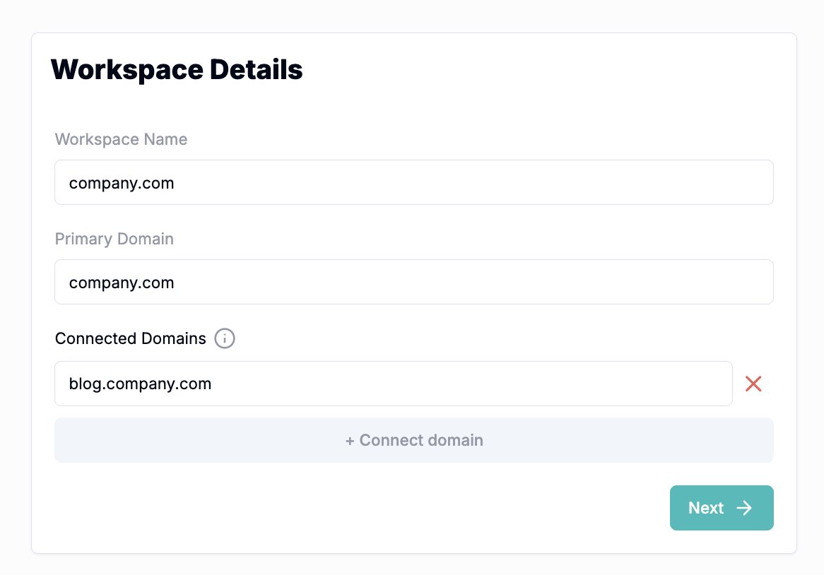 Your primary domain should already be pulled into HockeyStack (we get it from your email). However, you can add connected domains that you're using. They can be either different domains (e.g. company-event-2025.com) or subdomains (addresses that you're using in the following format: subdomain.domain.com, for example: blog.company.com). You need to add all of them to your setup by clicking "Connect domain".