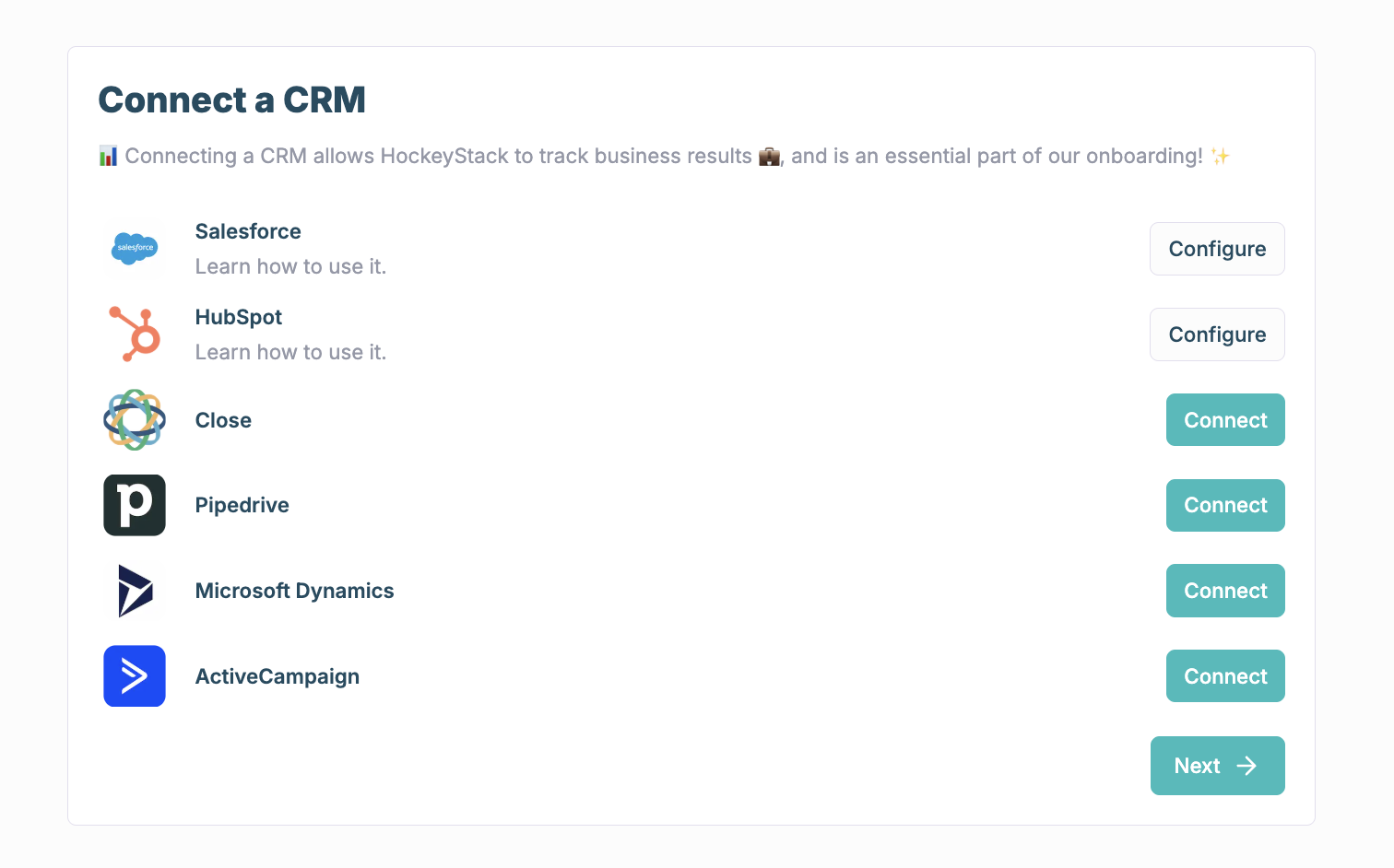 CRM data is the foundation for HockeyStack, which is why it's the first integration we recommend setting up. Pick your CRM system and click "Connect". If you have any problems, [here are the dedicated docs for the most popular CRMs.](https://docs.hockeystack.com/integrations/crms)
