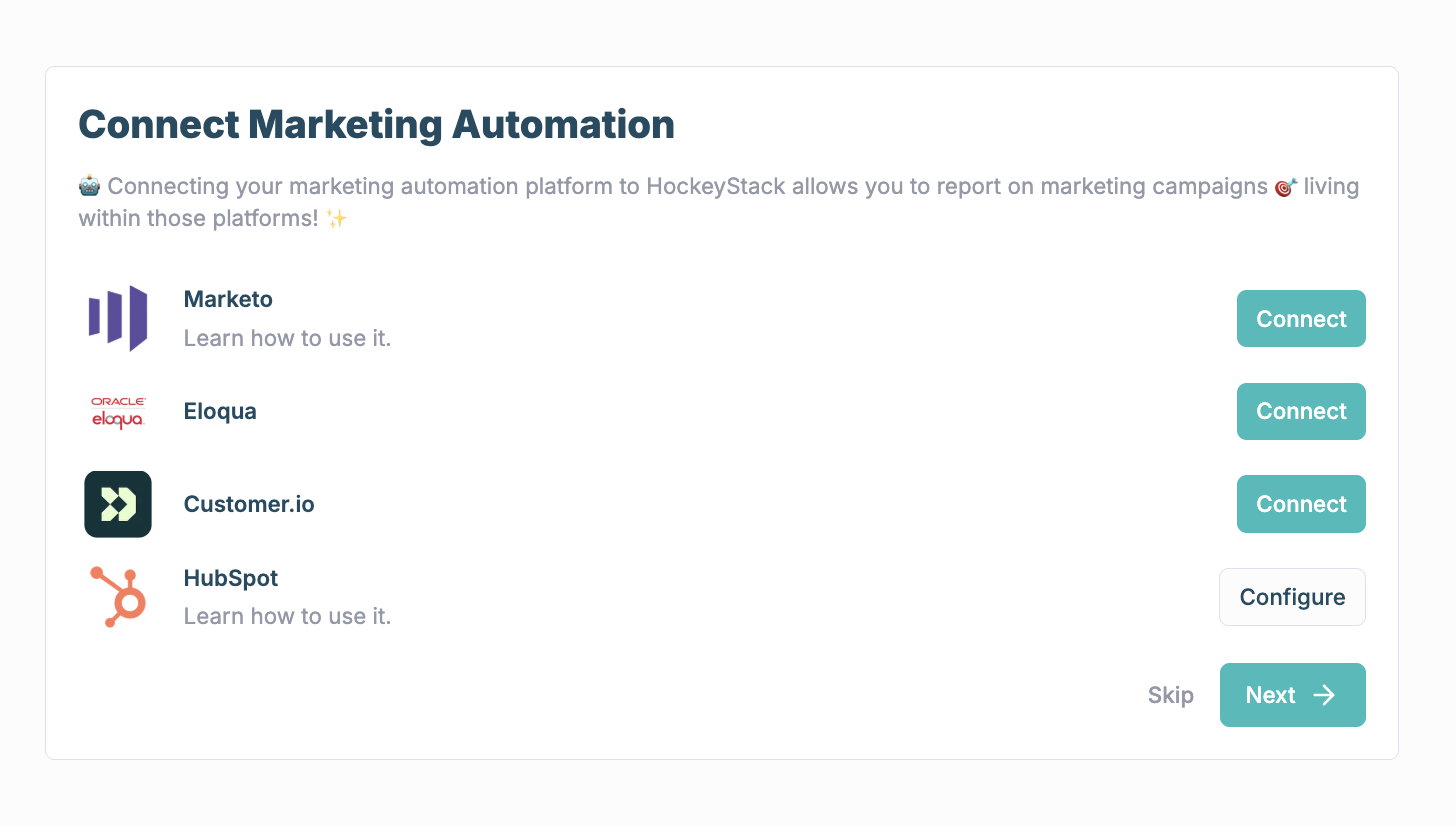 Another important source of your data is a marketing automation tool. You need to integrate it with HockeyStack, by clicking 'Connect'. Details about specific tools are available in [a dedicated doc.](https://docs.hockeystack.com/integrations/marketing-automation)