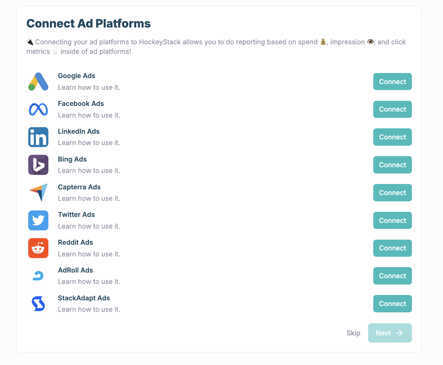 As the next step, you can integrate your ad platforms. We need those integrations to display detailed data, such as ad spend. If you need further instructions, they're available in a dedicated doc about [ad-platforms](https://docs.hockeystack.com/integrations/ad-platforms "mention").&#x20;