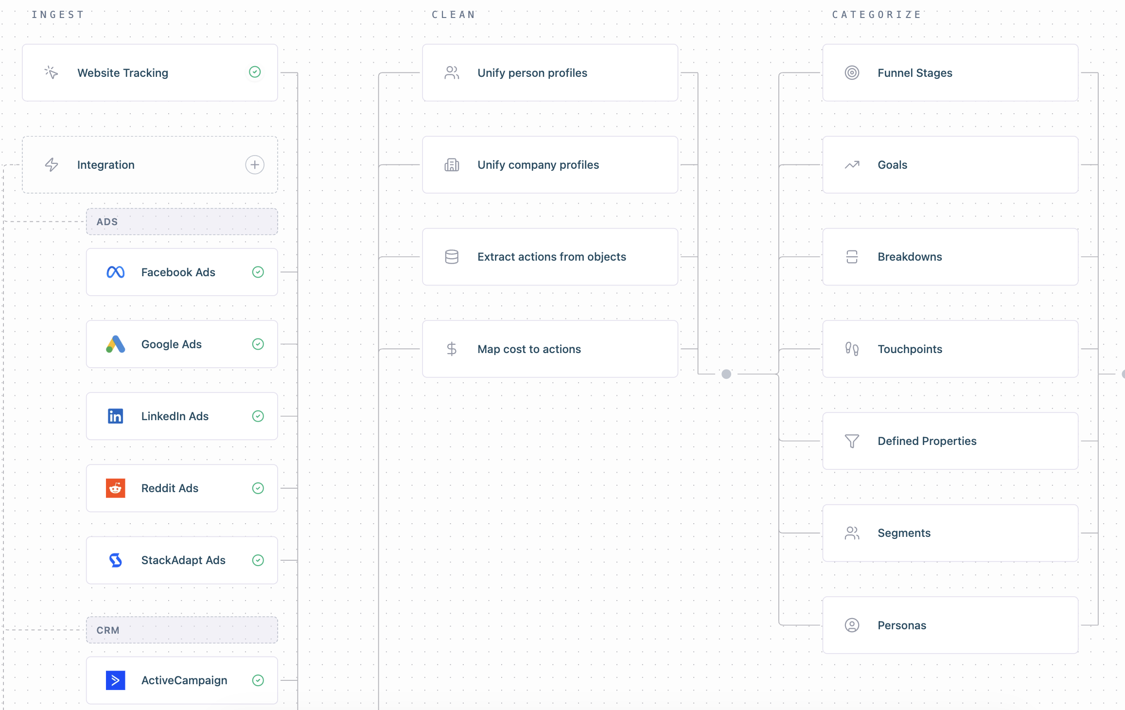 (If you are an admin), [Atlas](https://docs.hockeystack.com/documentation/the-hockeystack-data-model/atlas) will be your complete configuration canvas at HockeyStack. HockeyStack processes your data through a complete pipeline – from ingestion through transformation, categorization, activation, and export. Atlas gives you a single view of this entire flow, so you can: