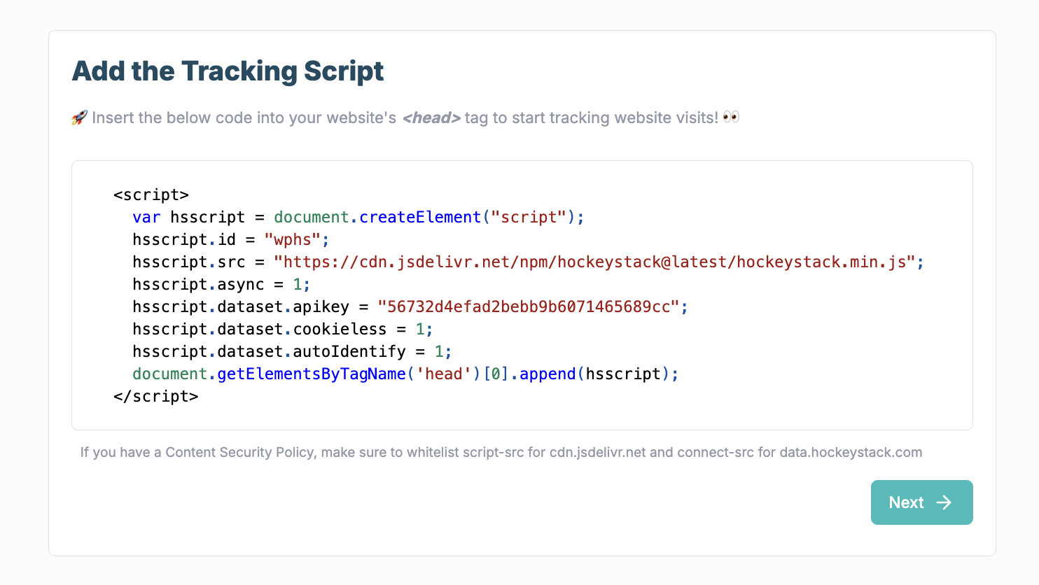 To be able to track your users' website actions, you need to install a HockeyStack tracking script on your website. Follow the instructions on the screen, and if you need more information, check out the [tracking](https://docs.hockeystack.com/technical-details/tracking "mention").&#x20;