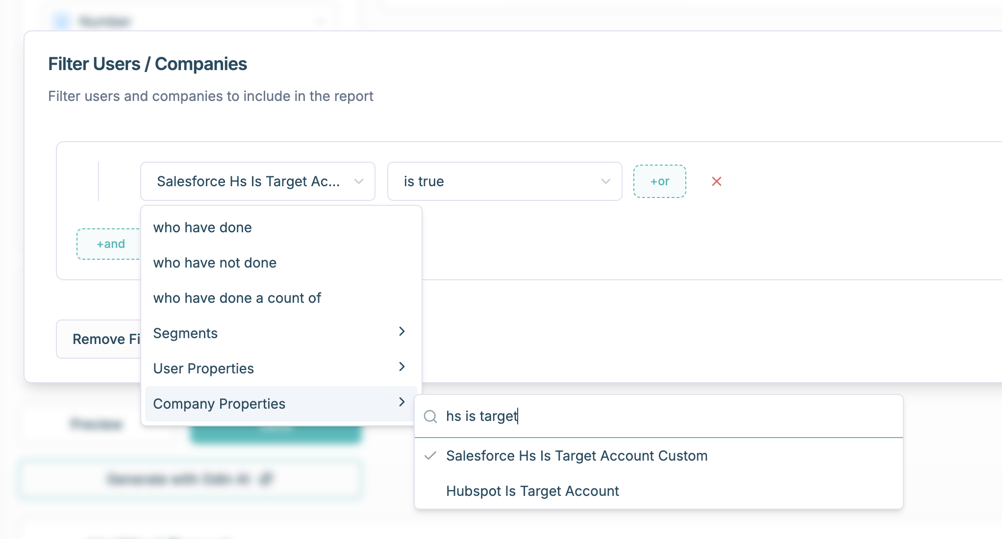 An important caveat about this report: Everything in HockeyStack is based on "actions". Actions are things that happen on a certain date, done in relation to a certain company/person. Dividing by "any action - companies" ensures that we get all companies that had any action within the timeframe of the report. So this will not encapsulate all actual accounts in list, only the ones that had actions. There is no current workaround for this.