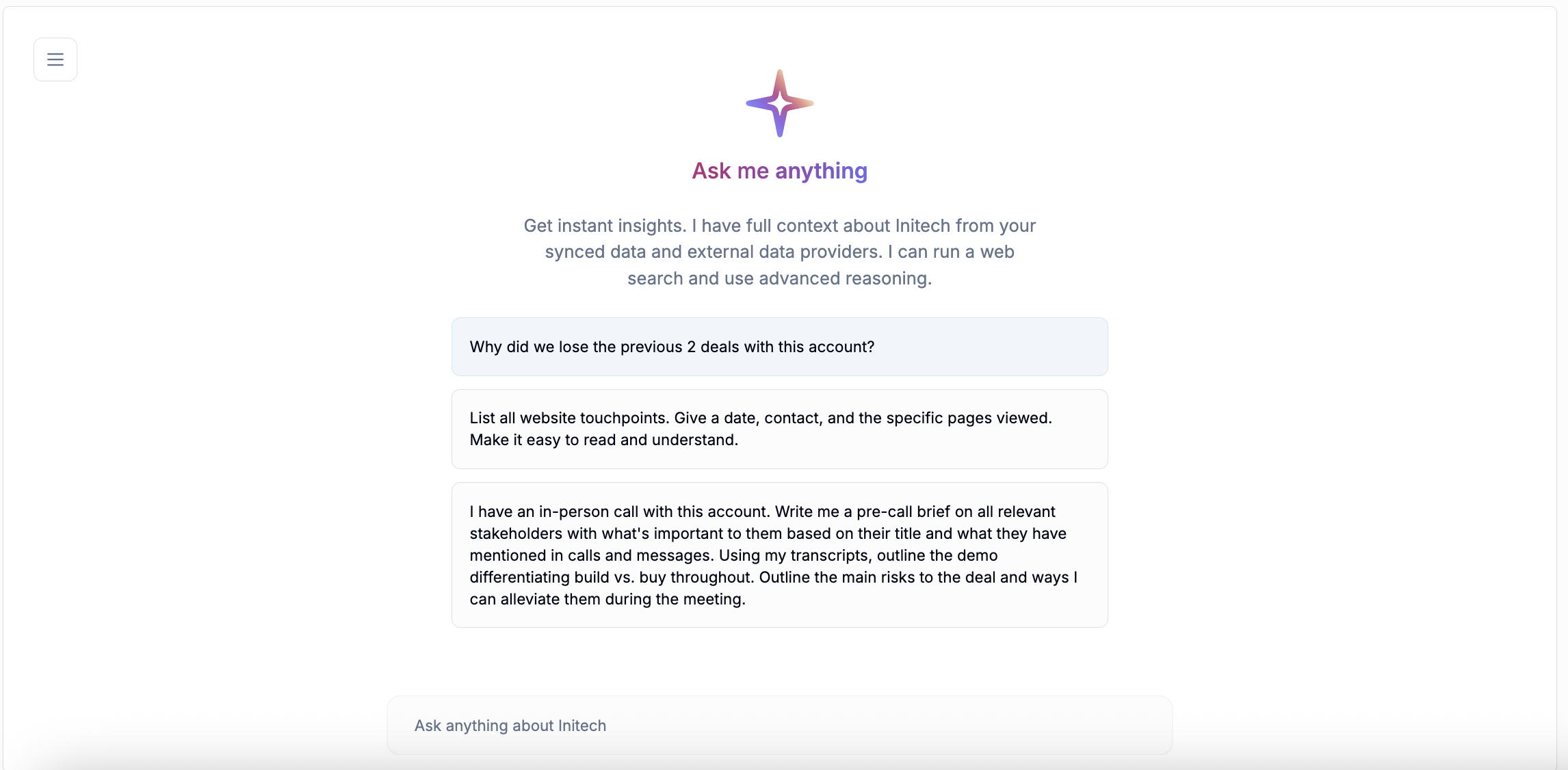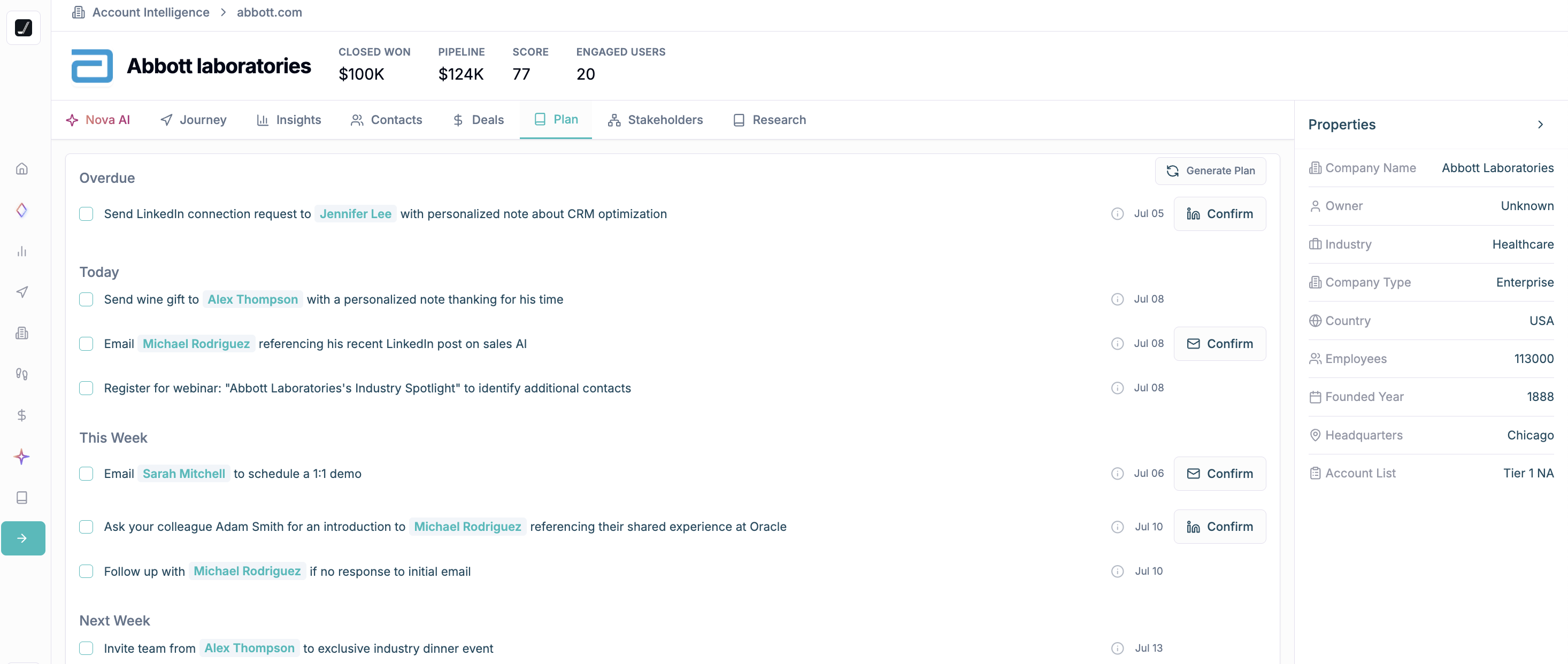 Account plan is a customized, AI-generated plan for each of your prospects. It brings together all your customer engagements—like website visits, webinars, Gong calls, and emails—alongside detailed product insights. Account Plan automatically creates a clear, actionable roadmap tailored to your business goals. It gives you precise guidance on what steps to take, why they matter, and when to take action for the biggest impact.