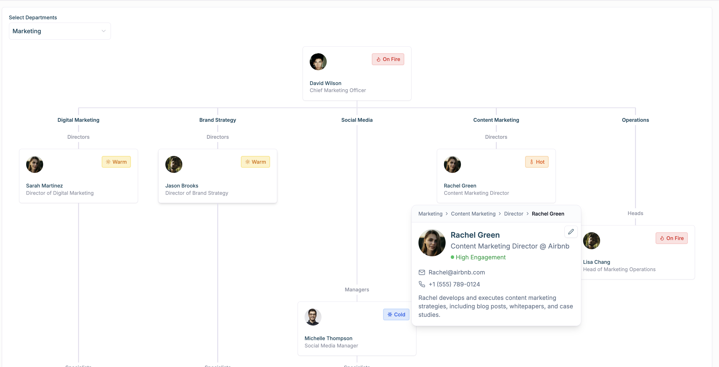 Stakeholder Map helps you understand the org structure of stakeholders in a prospective company. It uses the personas of interest you’ve pre-defined in Account Intelligence settings. You can also see person-level engagement for each identified stakeholder!
